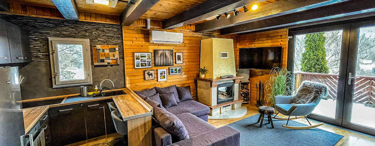 - Földszint: ágyazható kanapé, kandalló, panorámás kilátás, terasz, hűtő-fűtő klíma, sarokkádas fürdőszoba, felszerelt konyha, Nespresso kapszulás kávégép, okos tv.